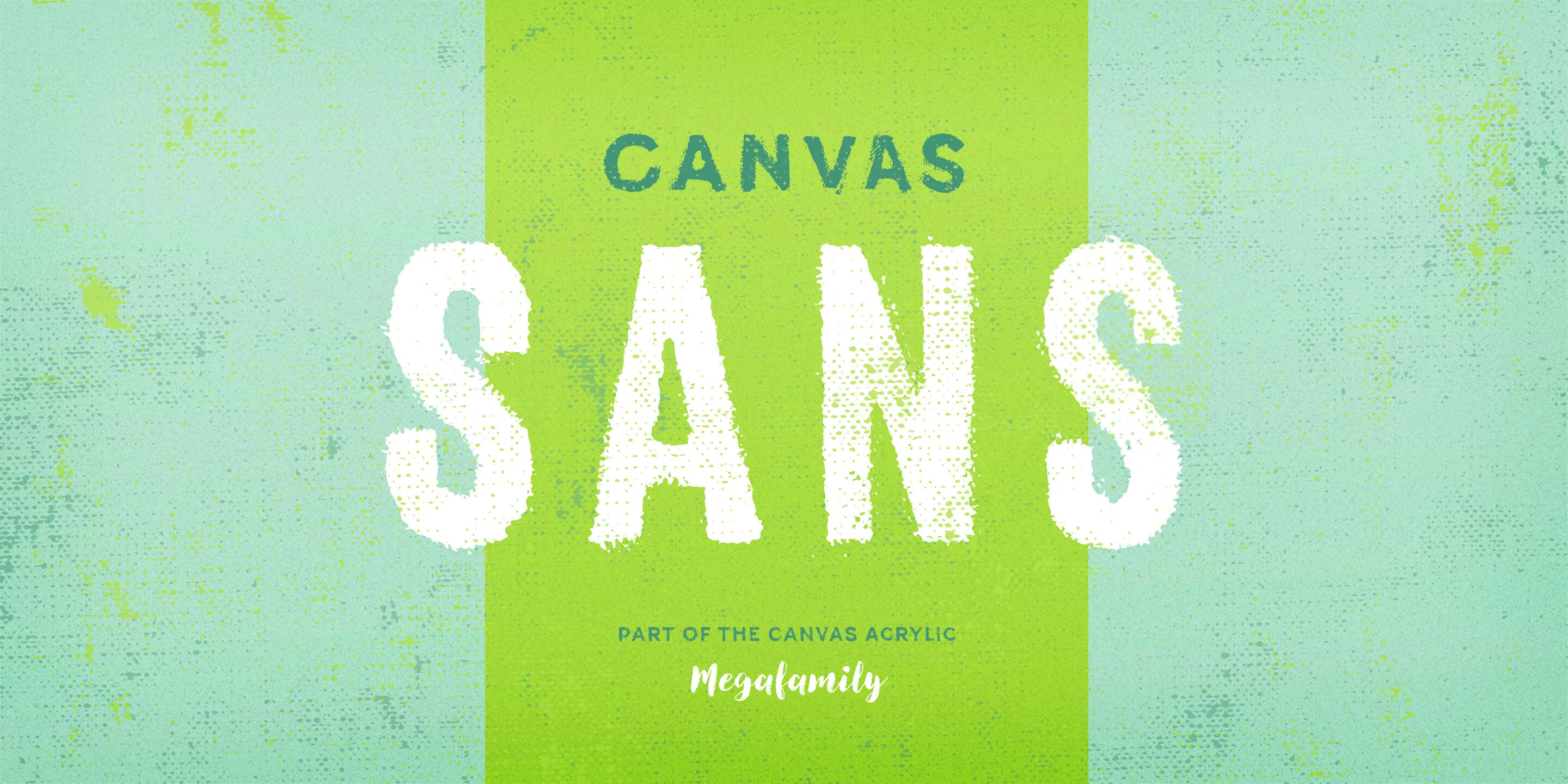 Canvas Sans is part of the Canvas Acrylic Megafamily. It includes Canvas 3D (a textured dimensional type set) and Canvas Basic (an all-caps geometric sans). It features authentic, hi-res texture that retains its realism even at very large sizes. Canvas Sans has double-letter ligatures that automatically fix adjacent duplicate letters. A bonus set of complimentary vector background textures, shapes and elements is available from the site.